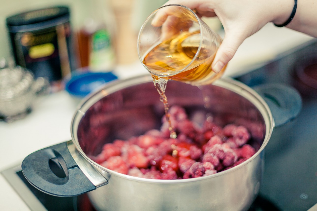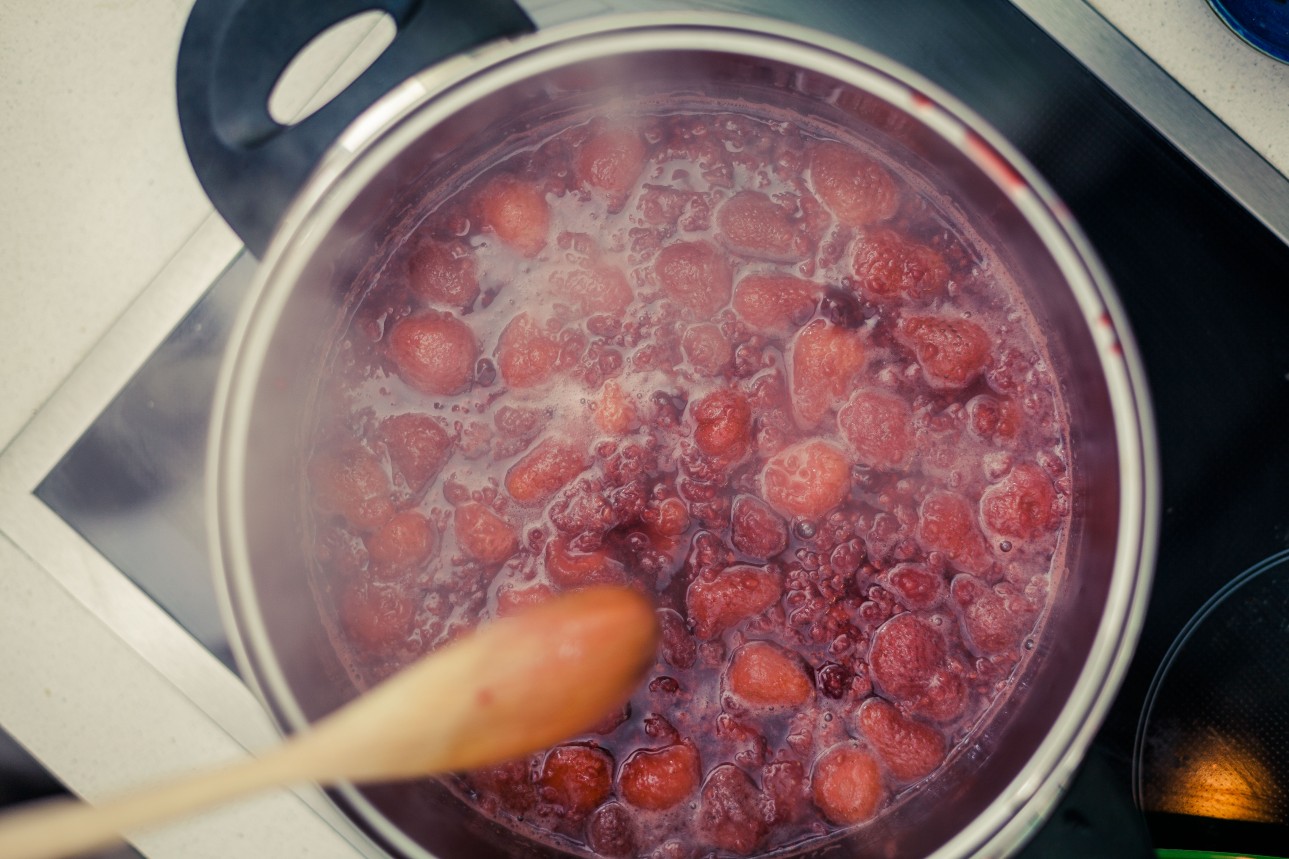 Do garnka wkładamy owoce, zalewamy 3,5 szklankami soku i zagotowujemy.